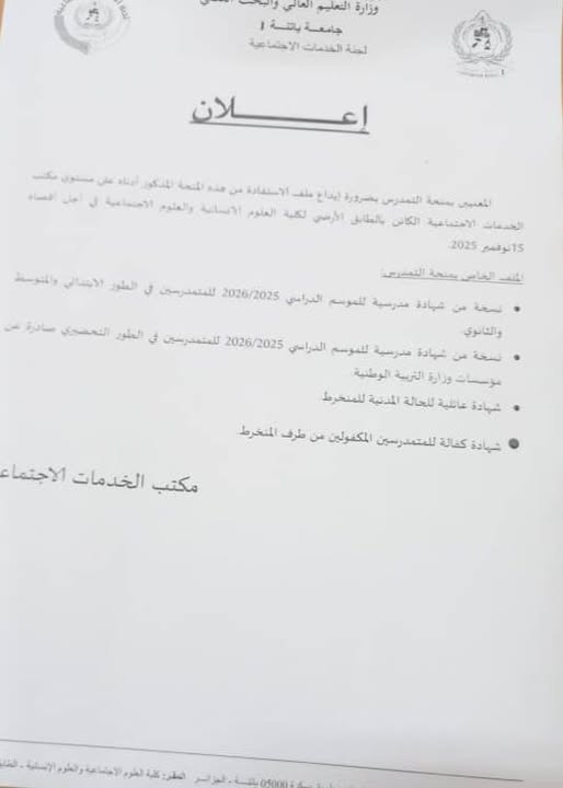 إعلان بخصوص منحة التمدرس الخاصة بلجنة الخدمات الإجتماعية