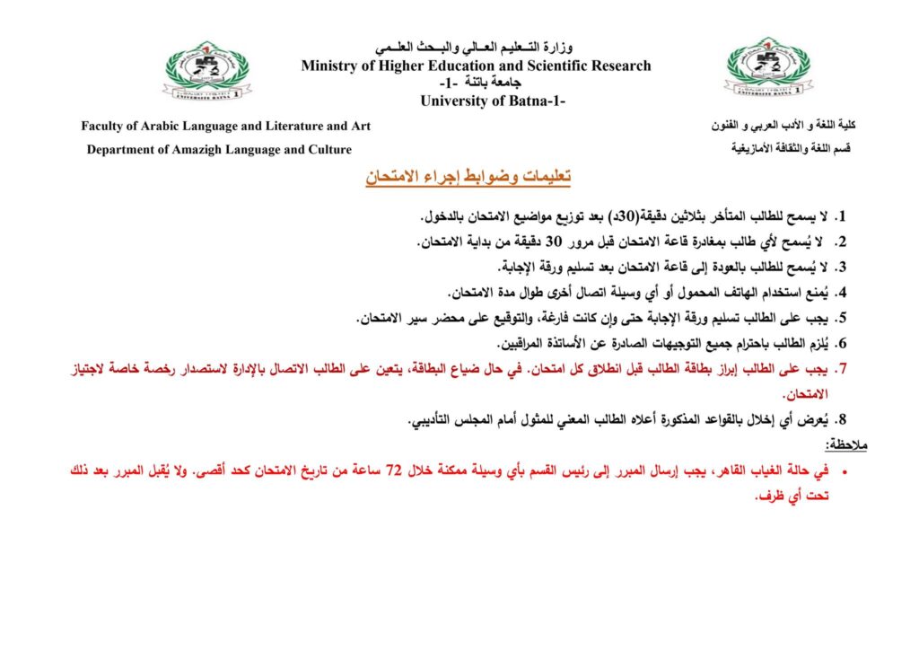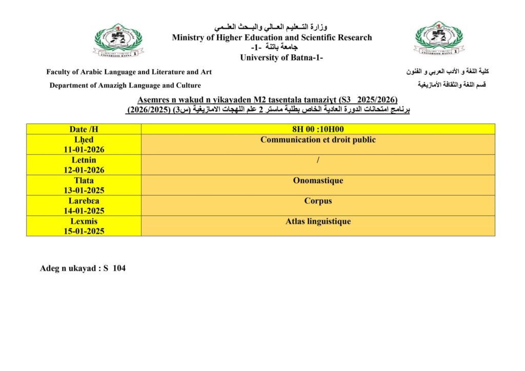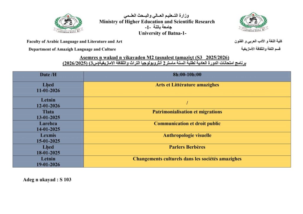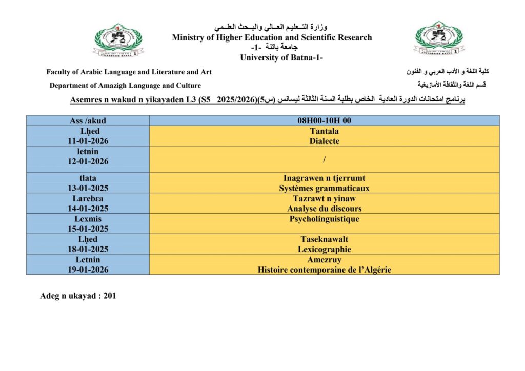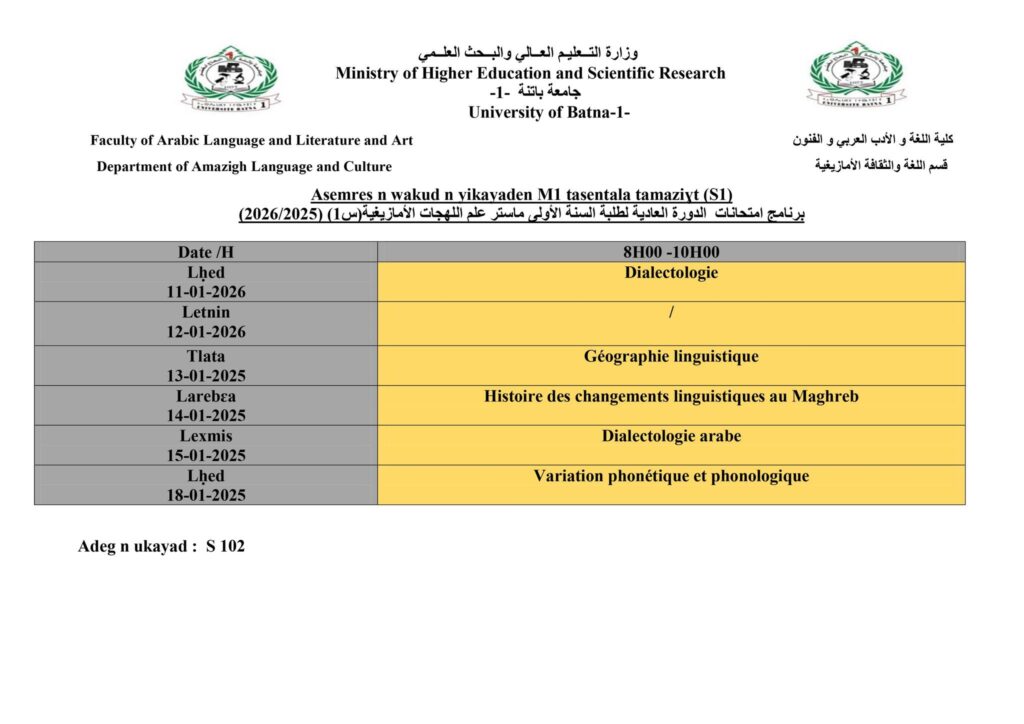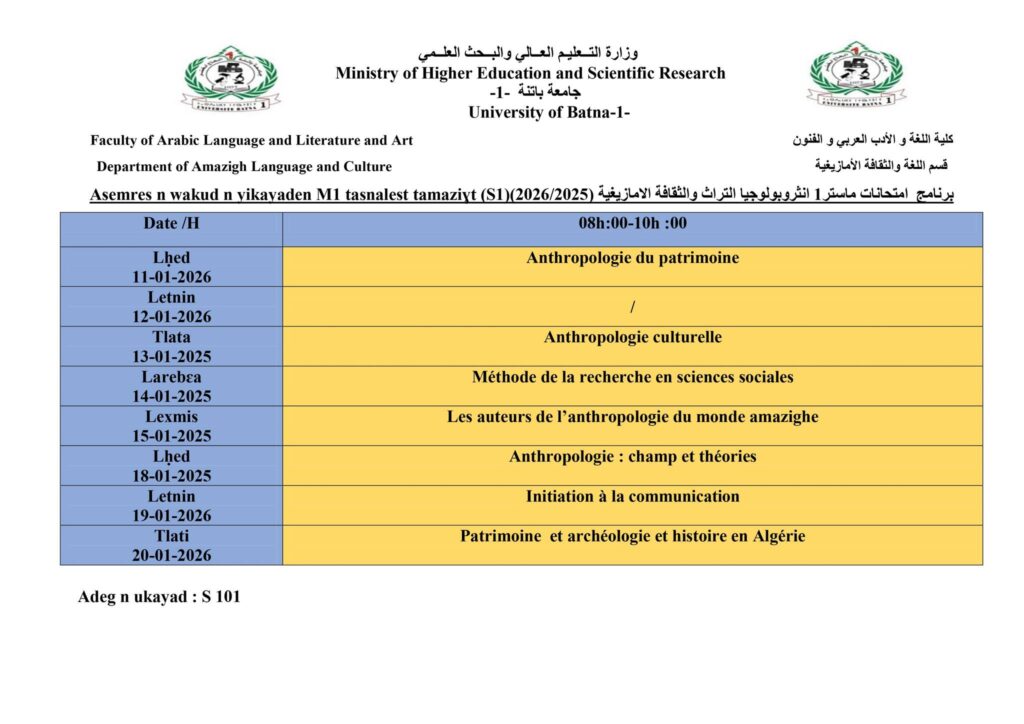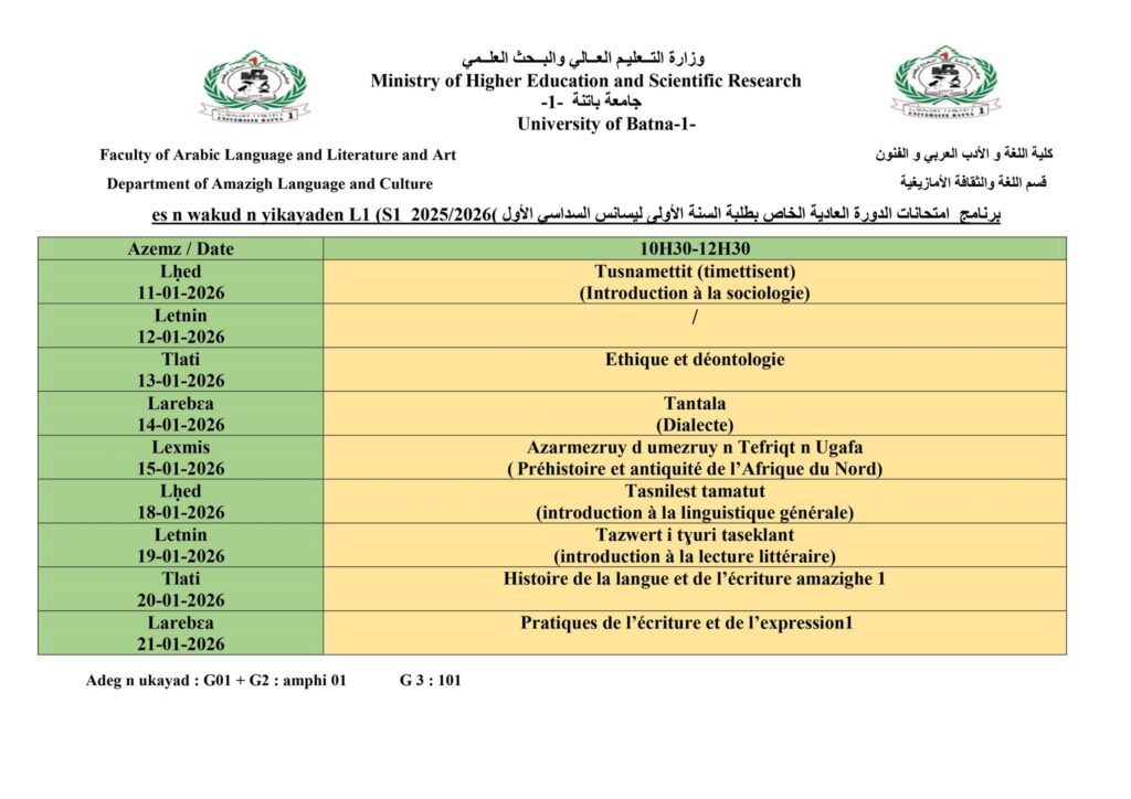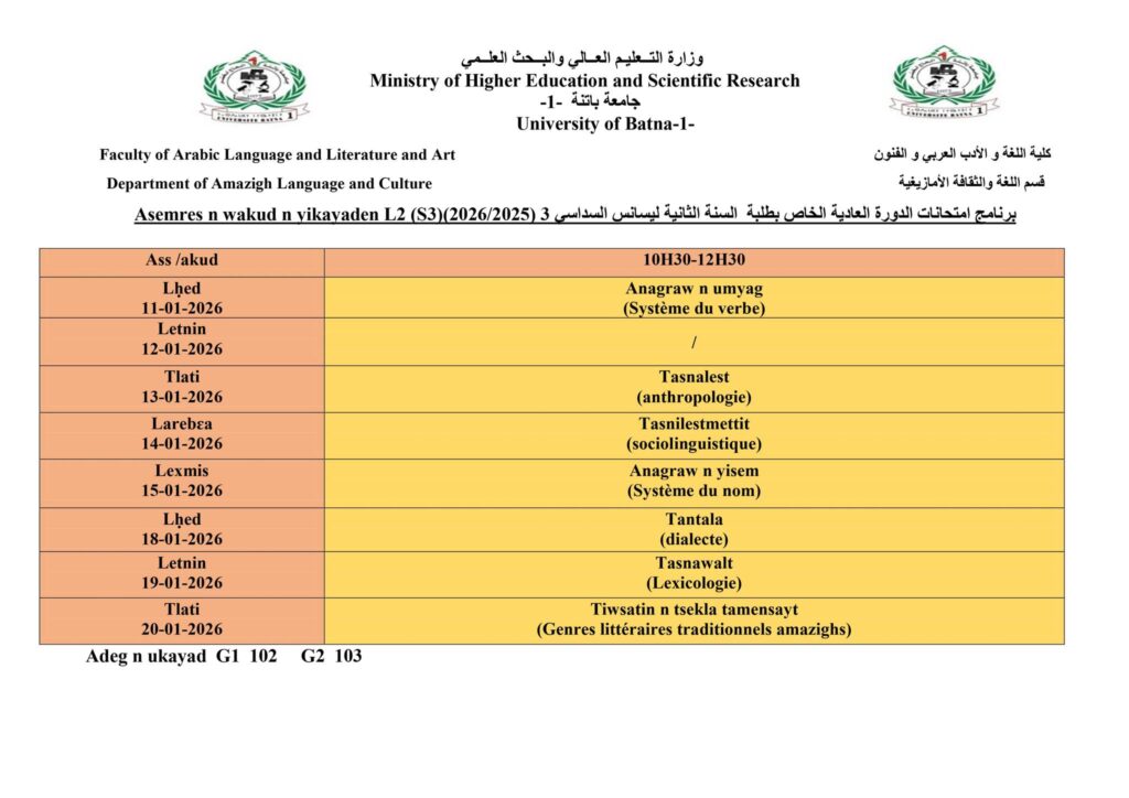 برنامج إمتحانات السداسي الأول قسم الأمازيغية