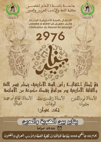 في إطار احتفاليات رأس السنة الأمازيغية (يناير 2976)، ينظم قسم اللغة والثقافة الأمازيغية بكلية اللغة و الأدب العربي و الفنون جامعة باتنة 01 يوما دراسيا بعنوان: