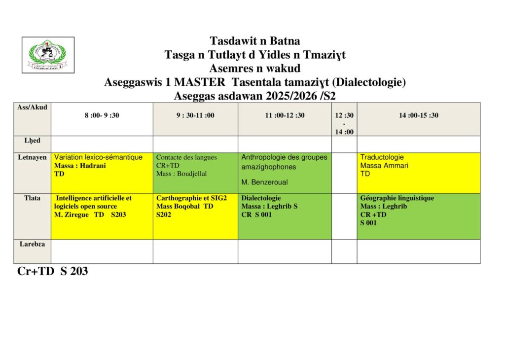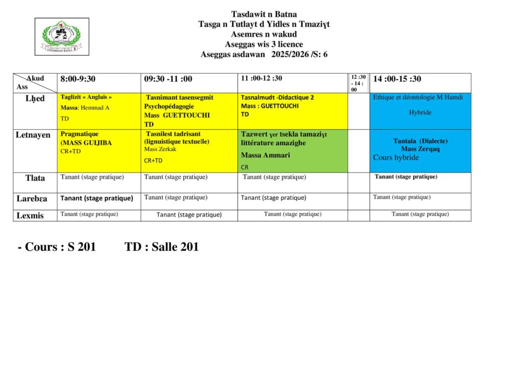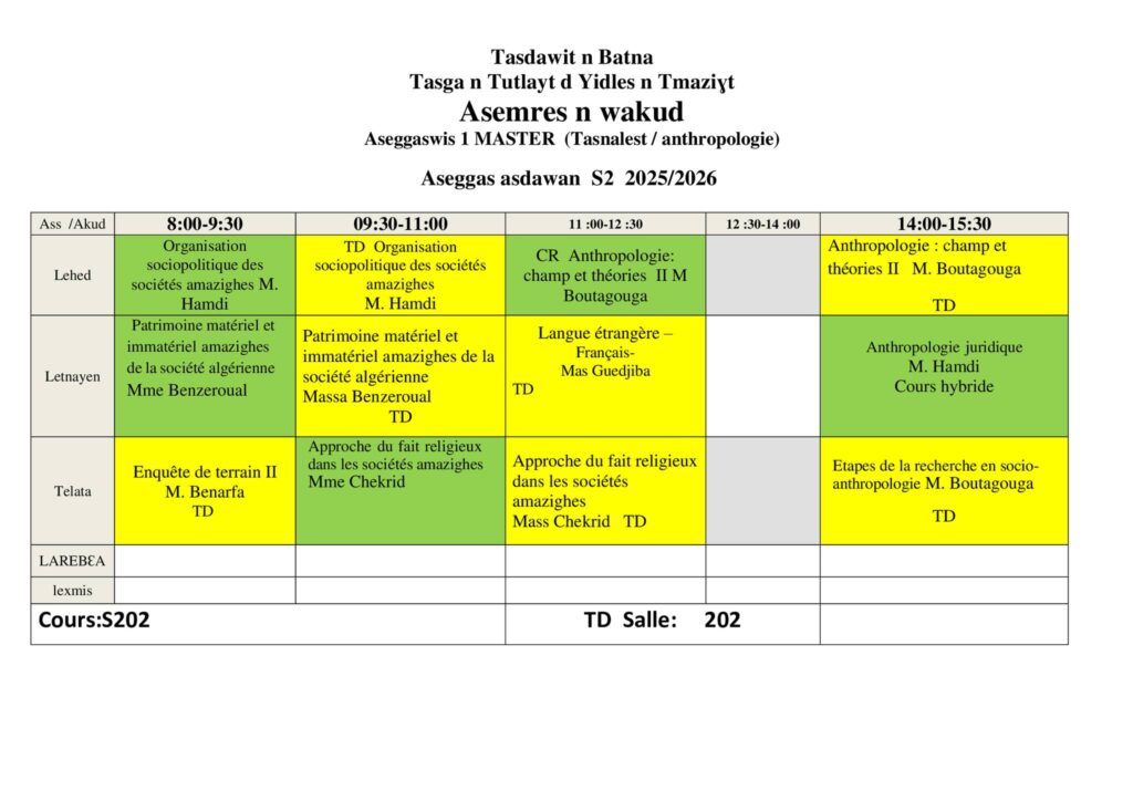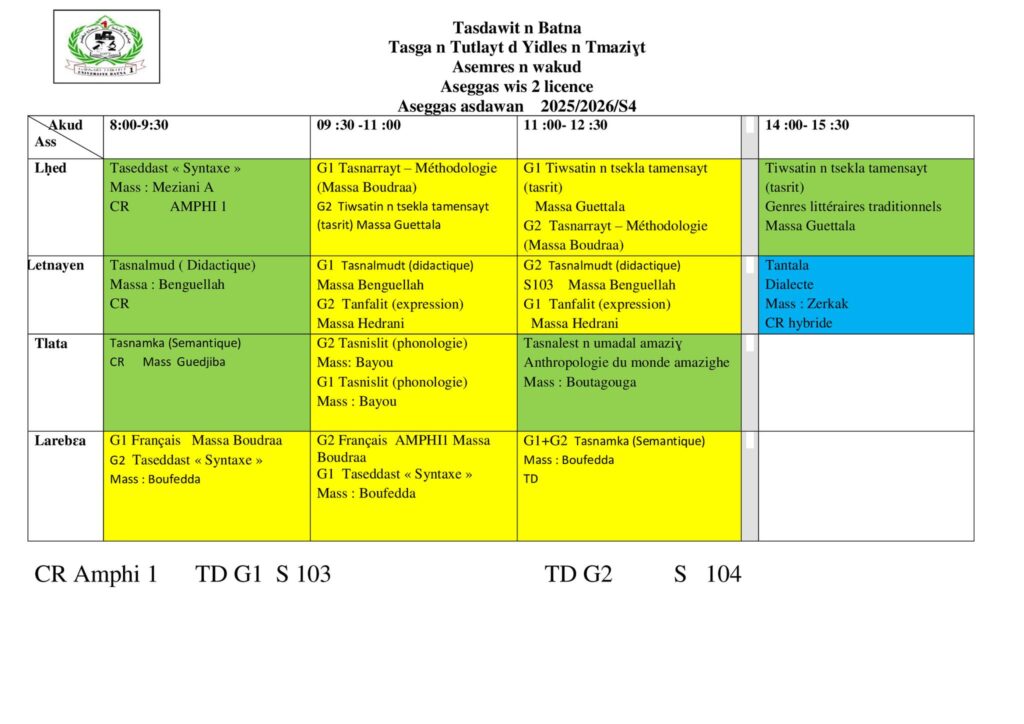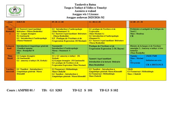 EMPLOIE DU TEMPS -SEMESTRE 2- AMAZIGHIA التوزيع الزمني للسداسي الثاني -أمازيغية-