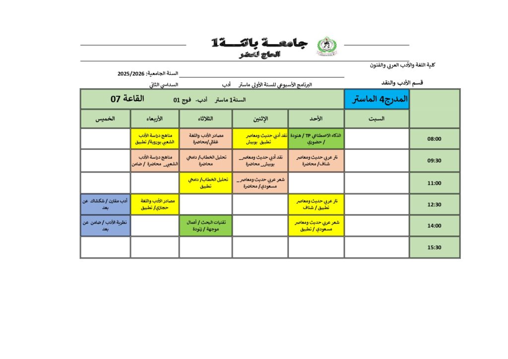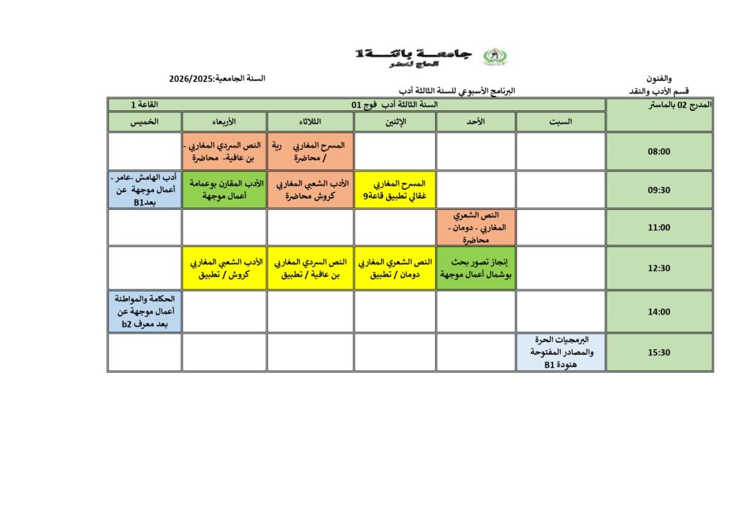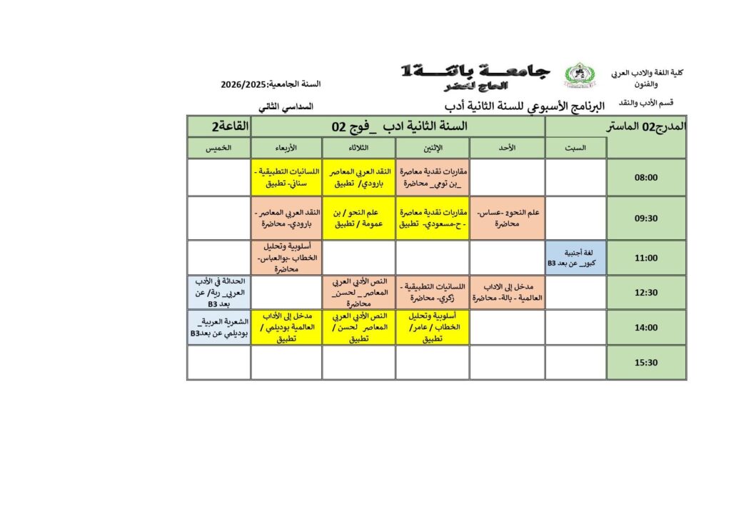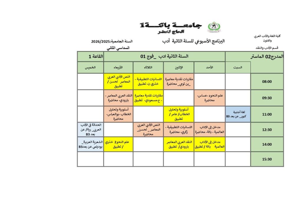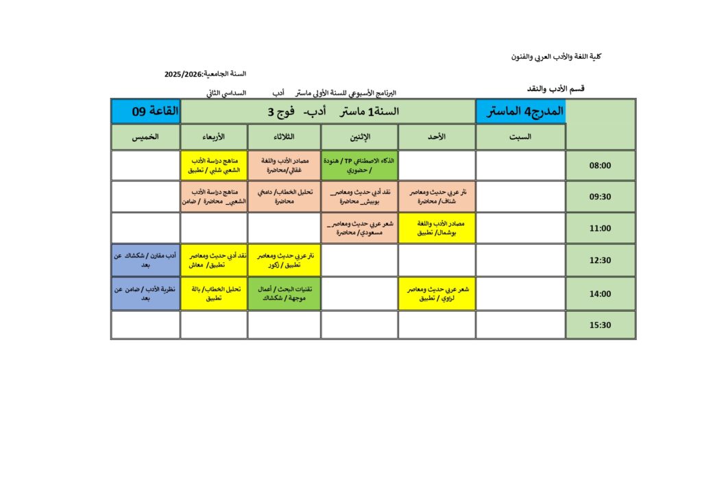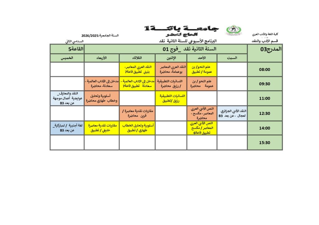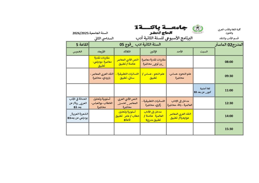 السنة أولى ماستر أدب عربي الفوج الأول GR 1الفوج الثاني GR2 GR 3الفوج الثالث الفوج الرابع GR 4الفوج الخامس GR 5 السنة أولى مـاستر نقد حديث و معاصر الفوج 1 GR1الفوج 2 GR2 السنة الثالثة ليسانس أدب الفوج الأولالفوج الثاني السنة الثالثة ليسانس نقد الفوج 1الفوج 2 السنة الثانية ليسانس نقد الفوج 1الفوج 2 السنة الثانية ليسانس أدب الفوج 1الفوج 2الفوج 3الفوج 4الفوج 5