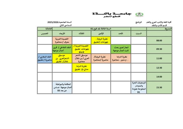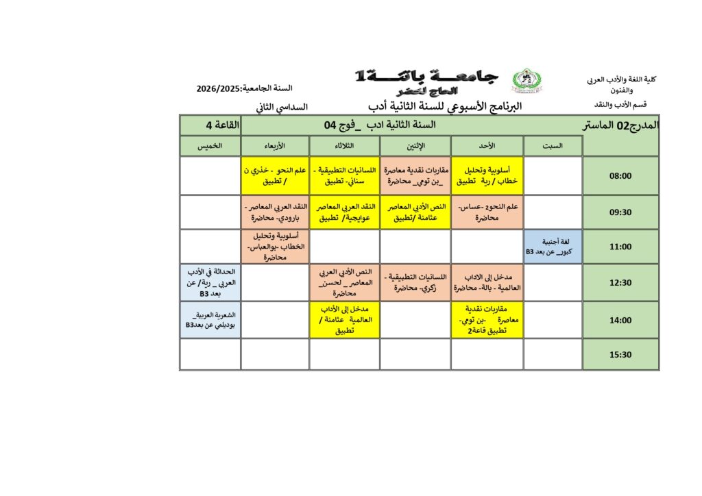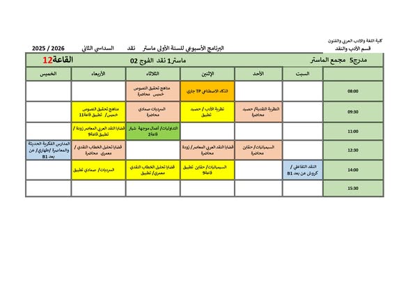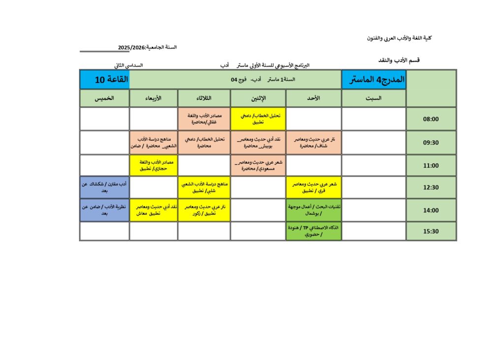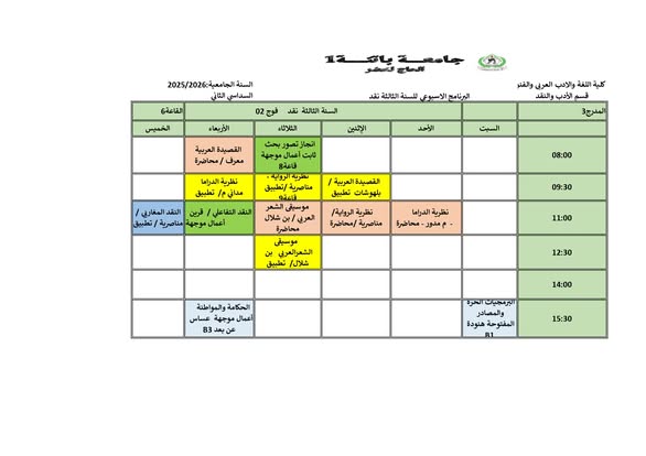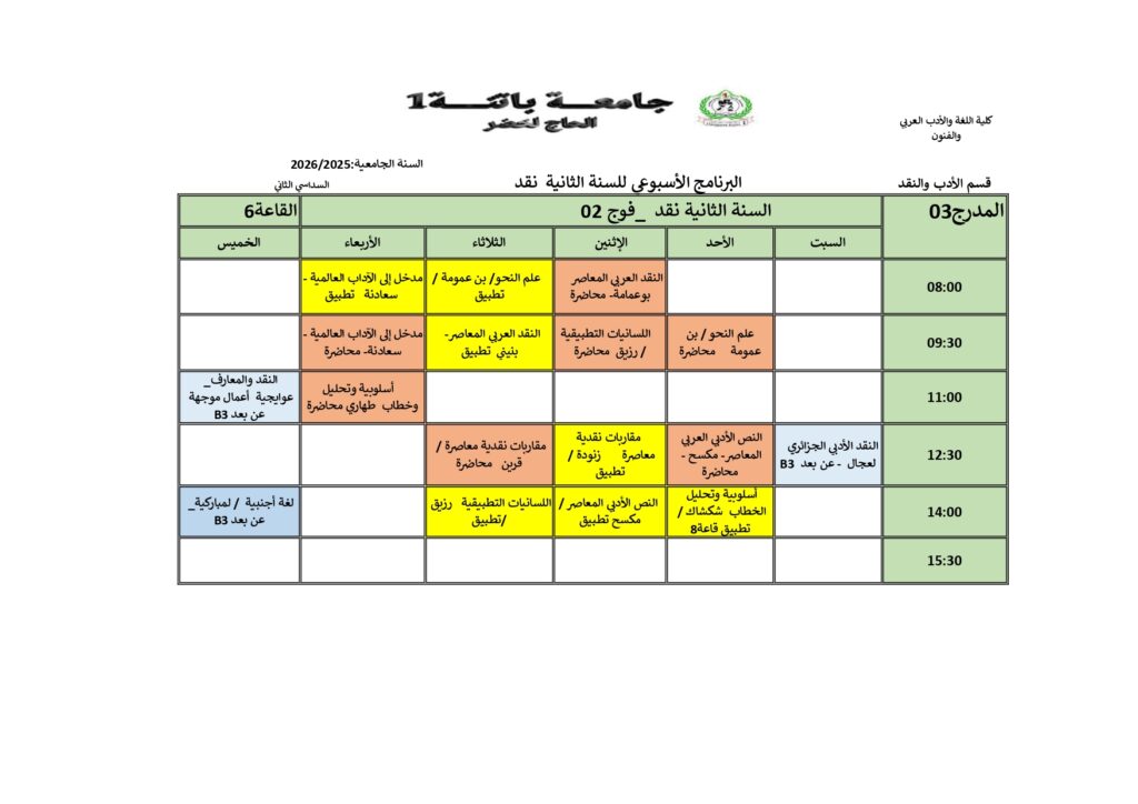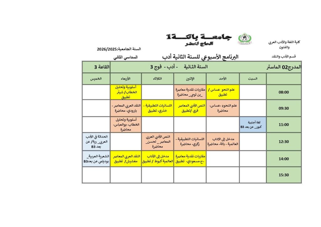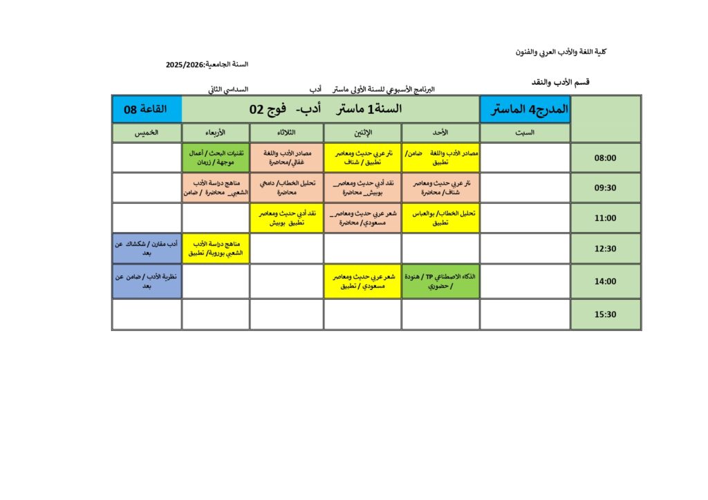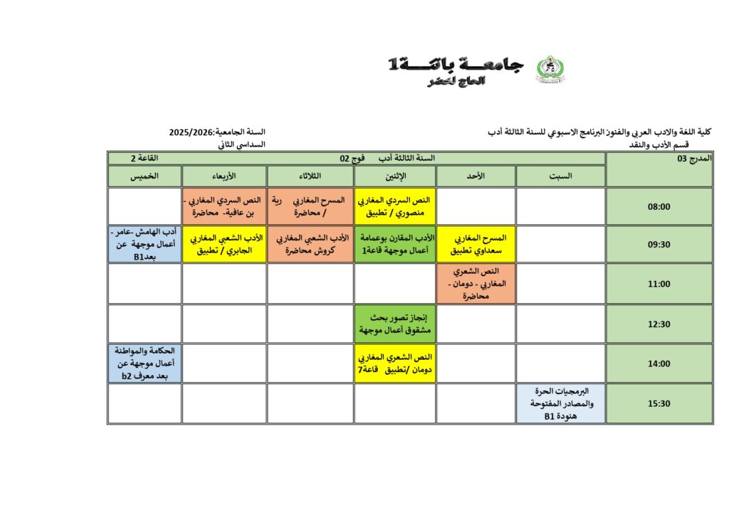 السنة أولى ماستر أدب عربي الفوج الأول GR 1الفوج الثاني GR2 GR 3الفوج الثالث الفوج الرابع GR 4الفوج الخامس GR 5 السنة أولى مـاستر نقد حديث و معاصر الفوج 1 GR1الفوج 2 GR2 السنة الثالثة ليسانس أدب الفوج الأولالفوج الثاني السنة الثالثة ليسانس نقد الفوج 1الفوج 2 السنة الثانية ليسانس نقد الفوج 1الفوج 2 السنة الثانية ليسانس أدب الفوج 1الفوج 2الفوج 3الفوج 4الفوج 5