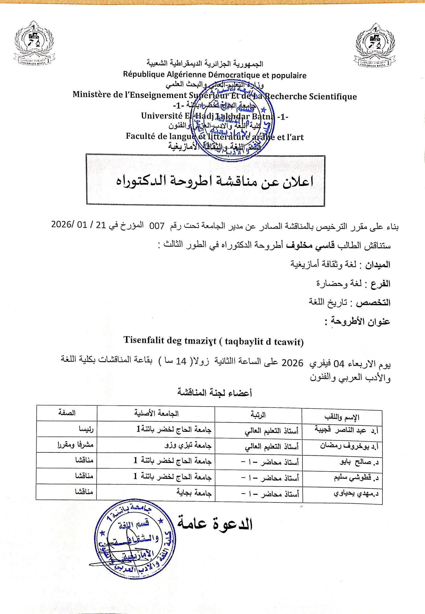 إعلان عن مناقشة أطروحة دكتوراه للطالب : قاسي مخلـوف