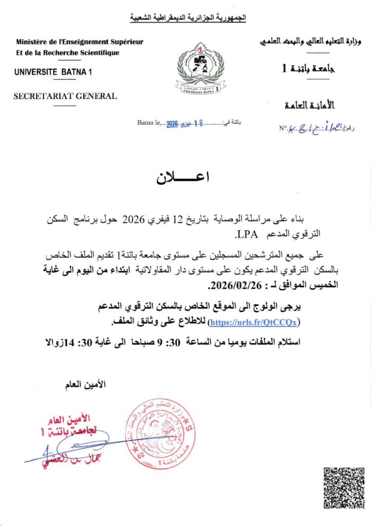 إعلان إلى الموظفين و الأساتذة بخصوص السكن الترقوي المدعم