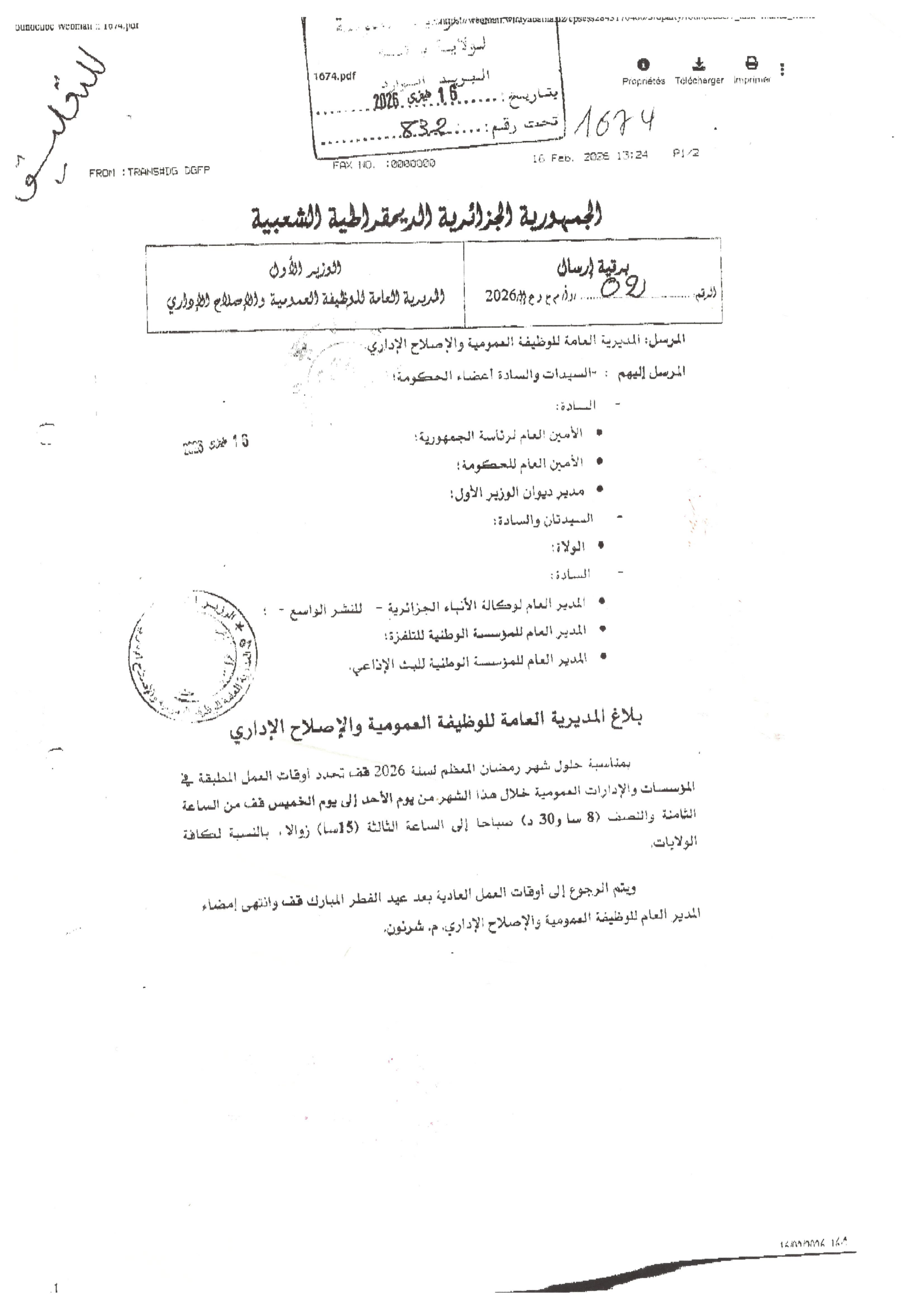 نعلمكم أن مواقيت العمل خلال شهر رمضان المعظم لعام 1447 هجري (2026 ميلادي) ستكون من الساعة الثامنة والنصف صباحا (08:30) إلى الساعة الثالثة زوالا (15:00).
