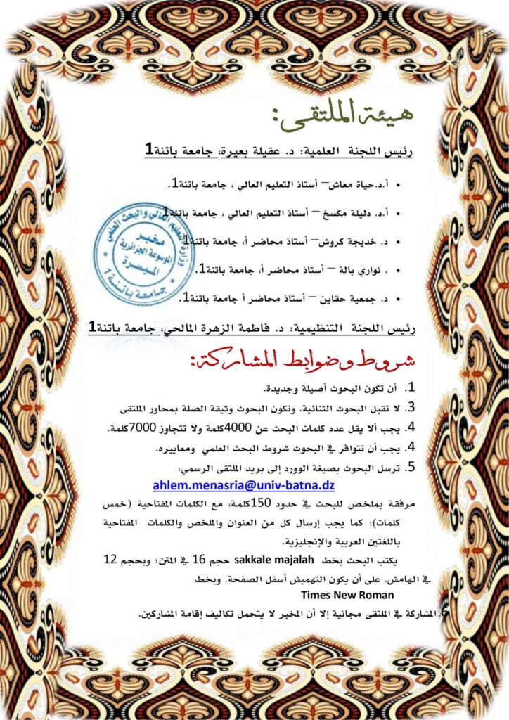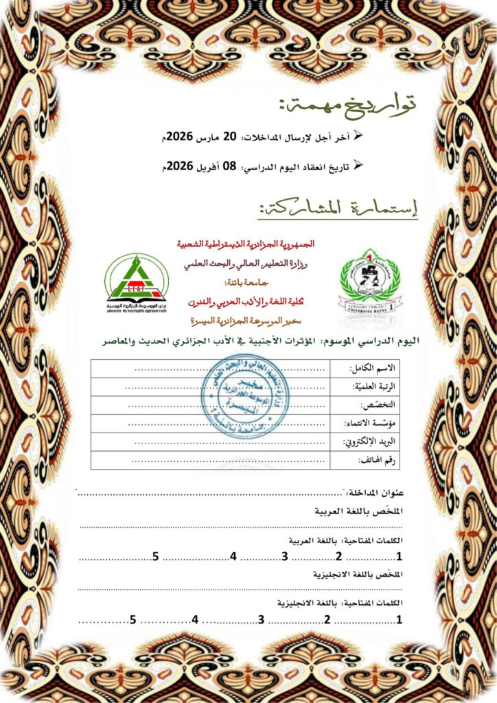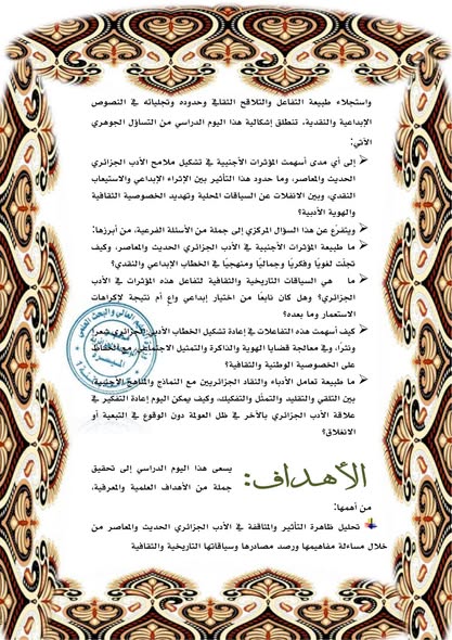 حضوركم إثراءٌ للنقاش العلمي ومساهمة في تعميق البحث في الأدب الجزائري الحديث والمعاصر.