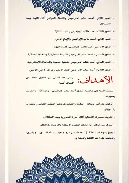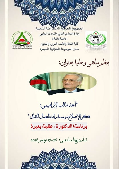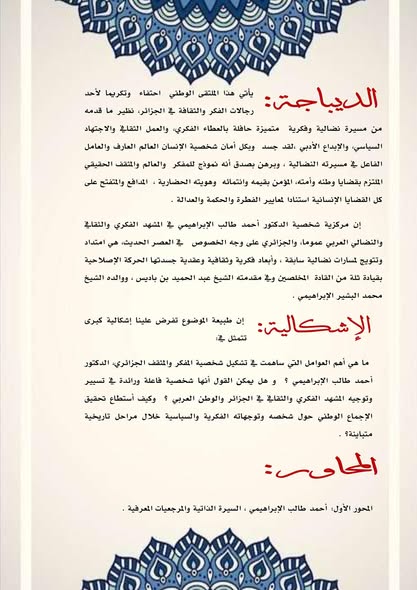 احتفاءً بالمسار الفكري والوطني لأحد أعلام الجزائر المعاصرين، المفكر والمجاهد أحمد طالب الإبراهيمي، واستجلاءً لإسهاماته في الإصلاح الثقافي وبناء الوعي الوطني في أبعاده التاريخية والحضارية.