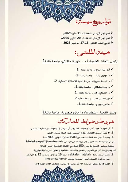 الدعوة مفتوحة للأساتذة والباحثين وطلبة الدكتوراه للمساهمة بأبحاثهم العلمية وإثراء محاور الملتقى