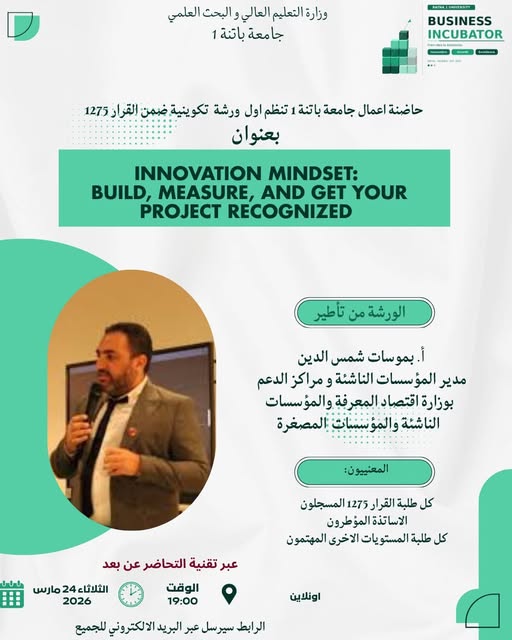 تعلن الحاضنة الجامعية عن انطلاق الورشات التدريبية للطلبة المنخرطين ضمن الآلية القرار الوزاري1275 للسنة الجامعية 2025-2026
