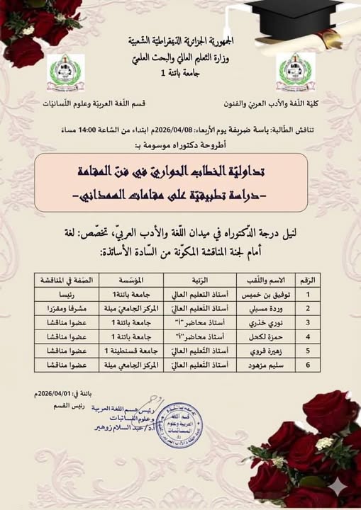 مناقشة أطروحة دكتوراه : للطالبة : كـريمة صـوالحية